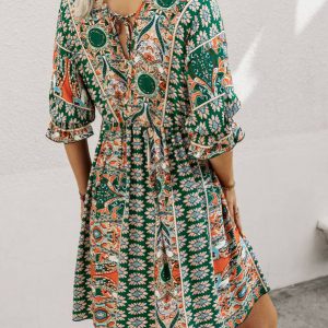 Floral Print Flounce Sleeve Overlap Collar Tie Back Dress