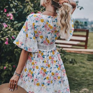 Floral Print Guipure Lace Panel Dress