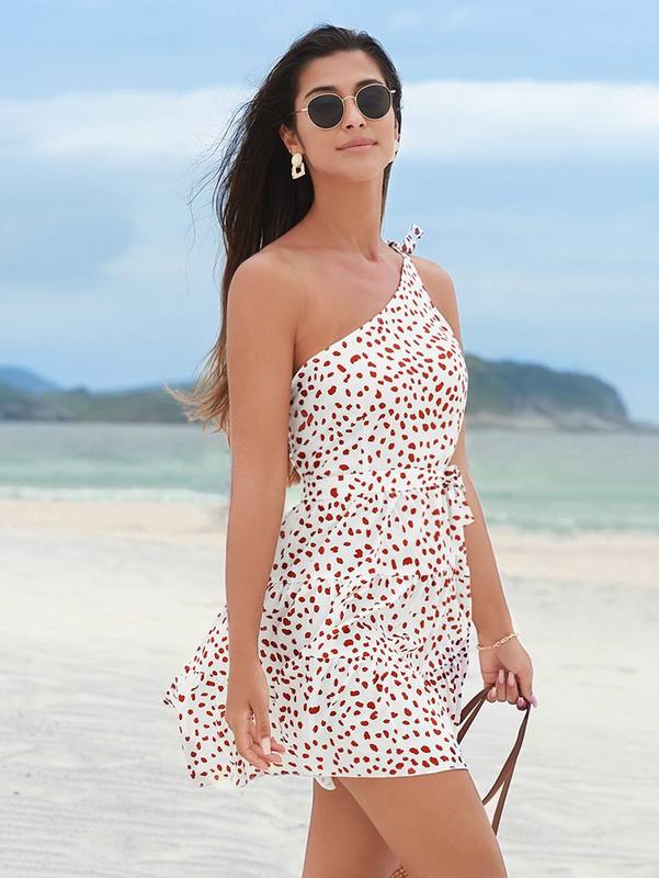 Be the first to review “Dalmatian Print One Shoulder Ruffle Hem Belted Dress” Cancel reply