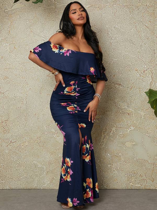 Floral Print Off Shoulder Ruched Slit Mermaid Hem Dress