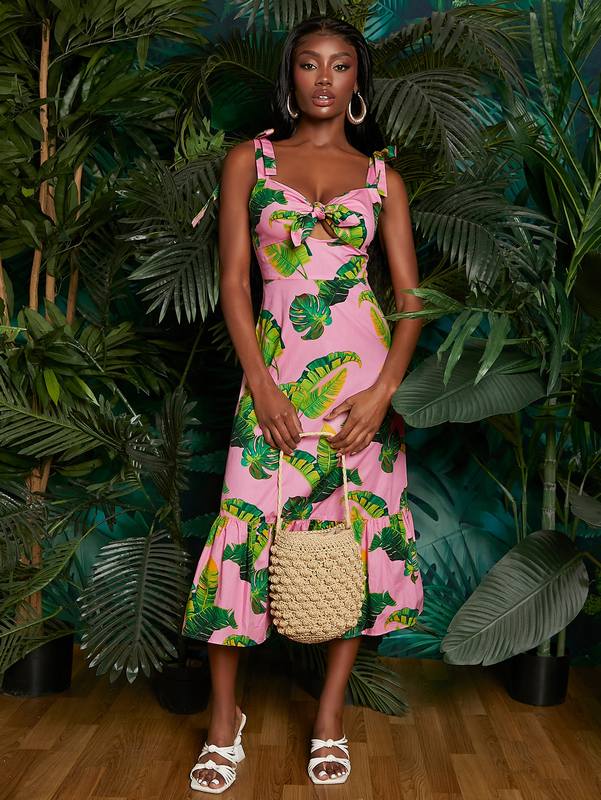Be the first to review “NEWNESS Tropical Print Tie Front Ruffle Hem Cami Dress” Cancel reply