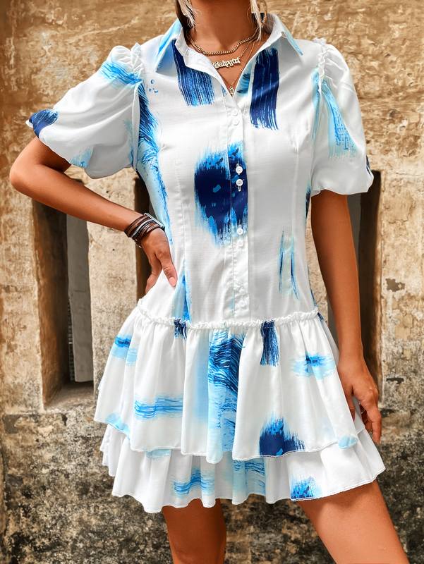 Random Tie Dye Puff Sleeve Ruffle Hem Dress