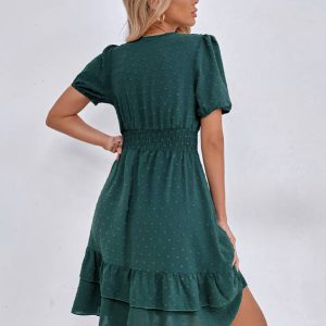 Puff Sleeve Surplice Neck Shirred Waist Ruffle Hem Swiss Dot Dress