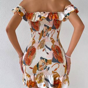 Floral Print Shirred Off Shoulder Ruffle Trim Bodycon Dress