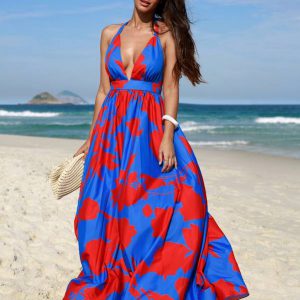 Floral Print Shirred Waist Tie Backless Halter Dress