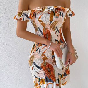 Floral Print Shirred Off Shoulder Ruffle Trim Bodycon Dress